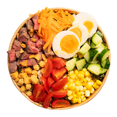 ベースサラダ・国産牛・ゆで卵・胡瓜・ミニトマト・クルトン・人参・コーン・フライドガーリック