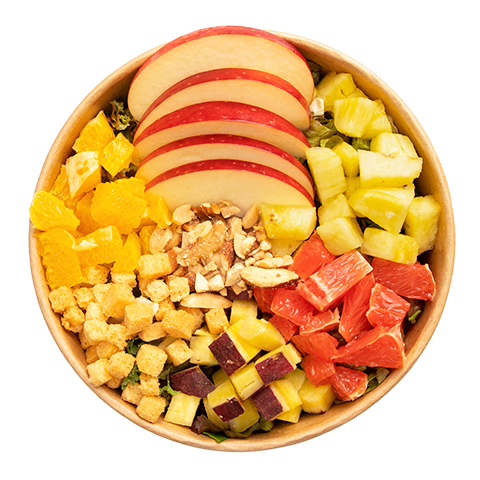 ベースサラダ・パイナップル・レッドグレープフルーツ・リンゴ・オレンジ・バナナ・ミックスナッツ・さつまいも・クルトン