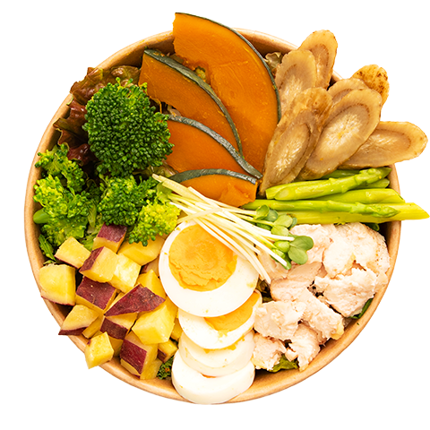 ベースサラダ・かぼちゃ・さつまいも・ミニアスパラ・ごぼう・ブロッコリー・自家製サラダチキン・貝割れ・ゆで卵