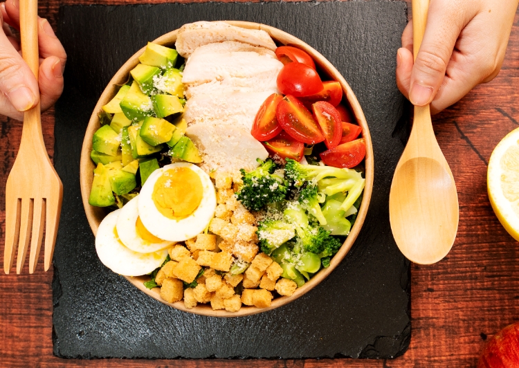 ベースサラダ・自家製サラダチキン・ミニトマト・ブロッコリー・アボガド・クルトン・パルメザンチーズ・ゆで卵