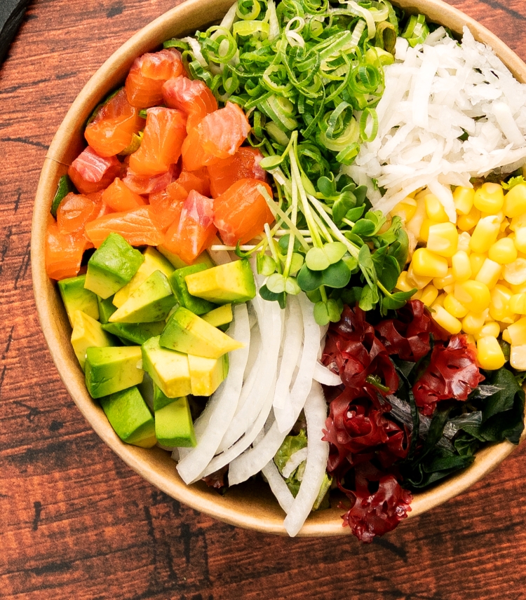 ベースサラダ・国産サーモン・海藻サラダ・アボガド・コーン・九条葱・大根・淡路玉葱スライス・貝割れ